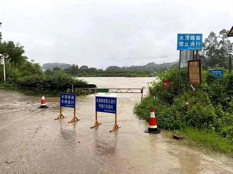2022年6月17日10时20分,受强降雨影响S206线(荔浦至廉江公路)K11+450-K11+550段(荔浦市茶城乡过村村)过水路段因上游河水上涨,水淹路面深度约0.8米,导致交通中断,过往车辆可绕行屯留村,现场无滞留车辆。荔浦公路养护中心人员已在水淹路段设置好标志标牌,禁止过往群众通行。因降雨还在持续,预计通车时间6月21日10:20分。(徐  辉)