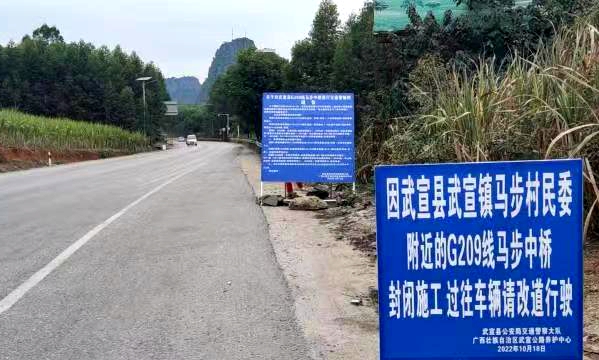 G209线K3425+411处武宣县武宣镇马步村民委附近马步中桥因危旧桥加固维修施工需要,将于2022年10月25日上午8时至2023年1月18日中午12时实施封闭交通管制,行人及车辆禁止通行。武宣至贵港覃塘区绕行路线如下:
