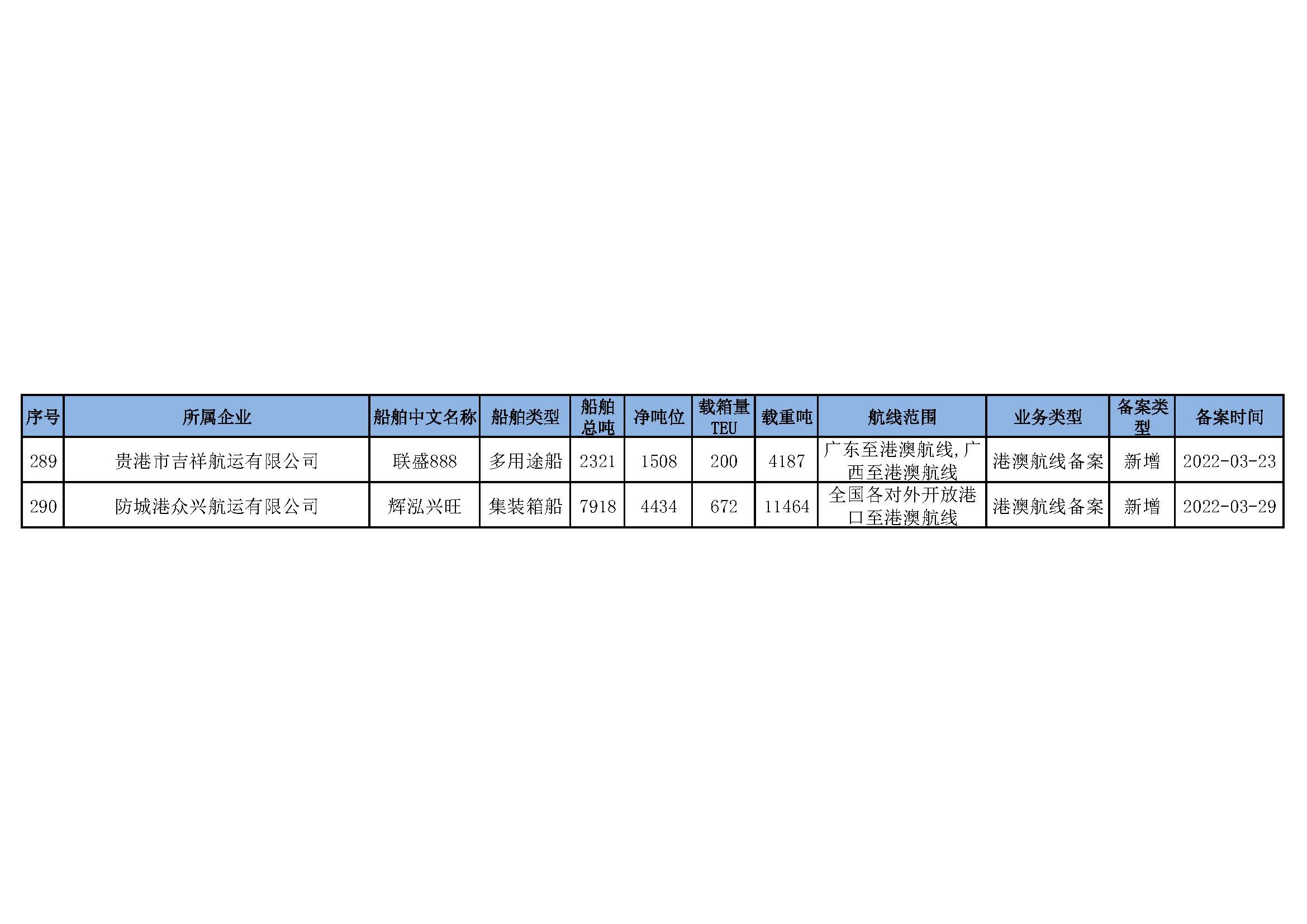 截至2022年3月31日在91porn部水路运输建设综合管理信息系统完成备案的港澳航线水路运输船舶