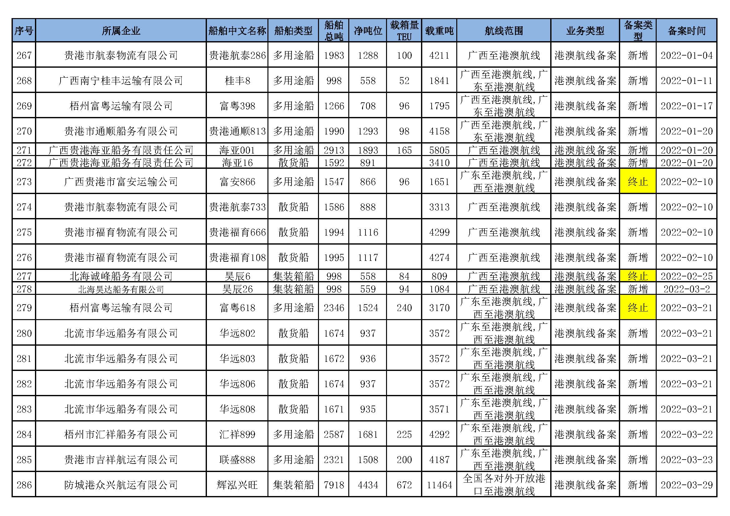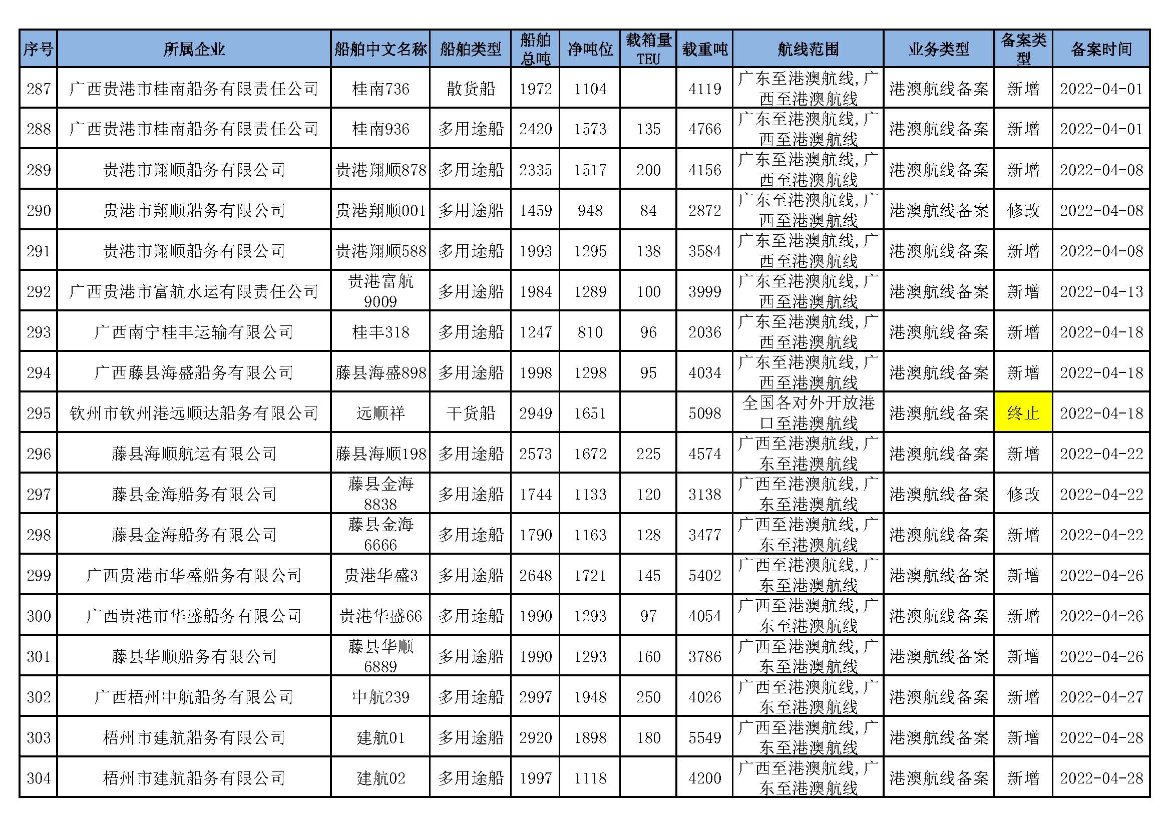 截至2022年4月30日在91porn部水路运输建设综合管理信息系统完成备案的港澳航线水路运输船舶
