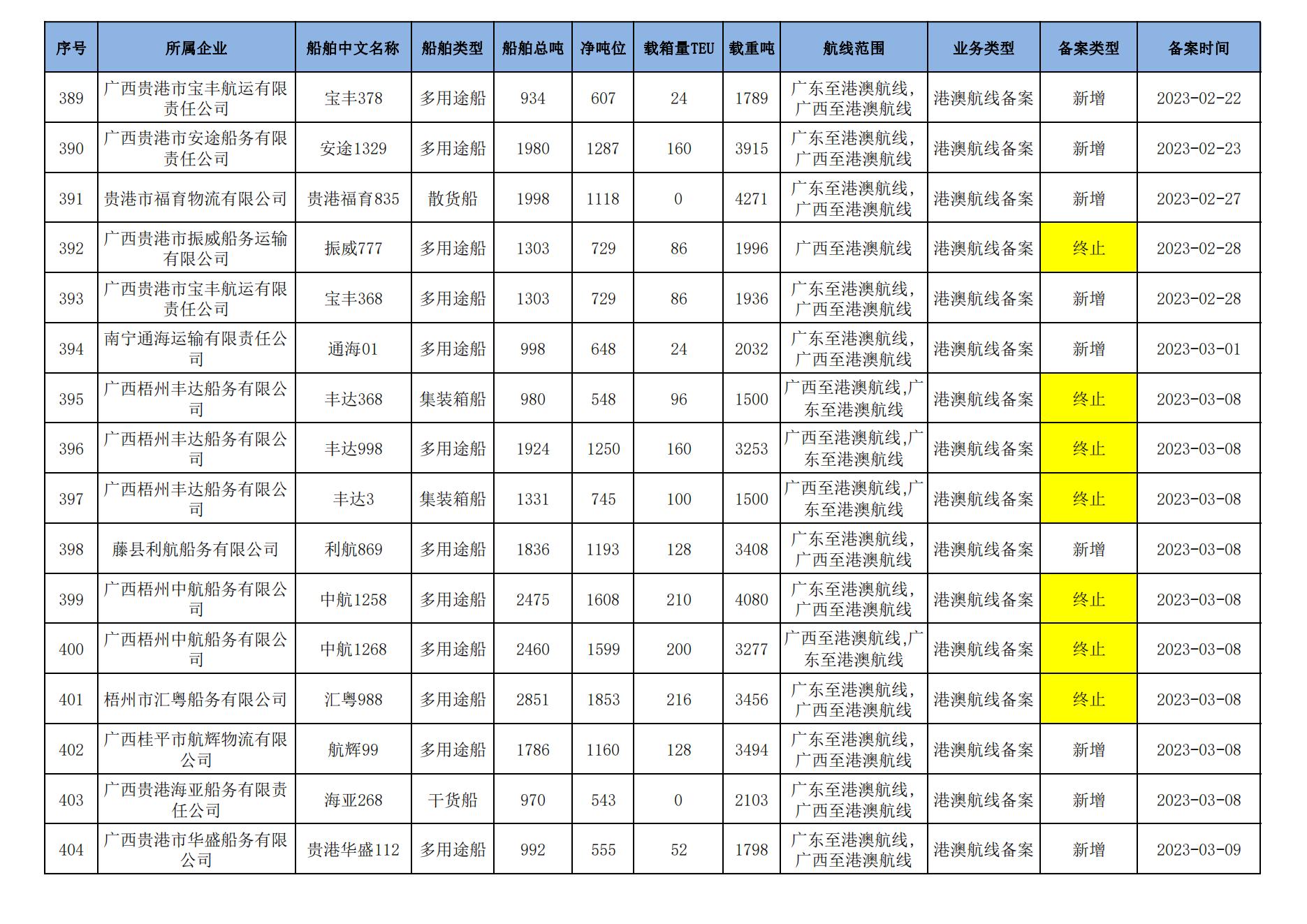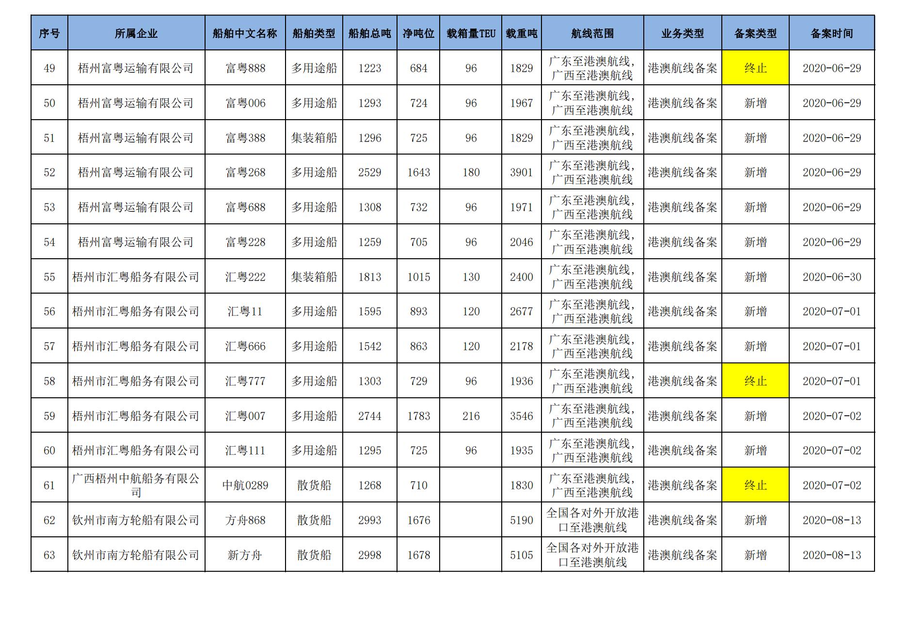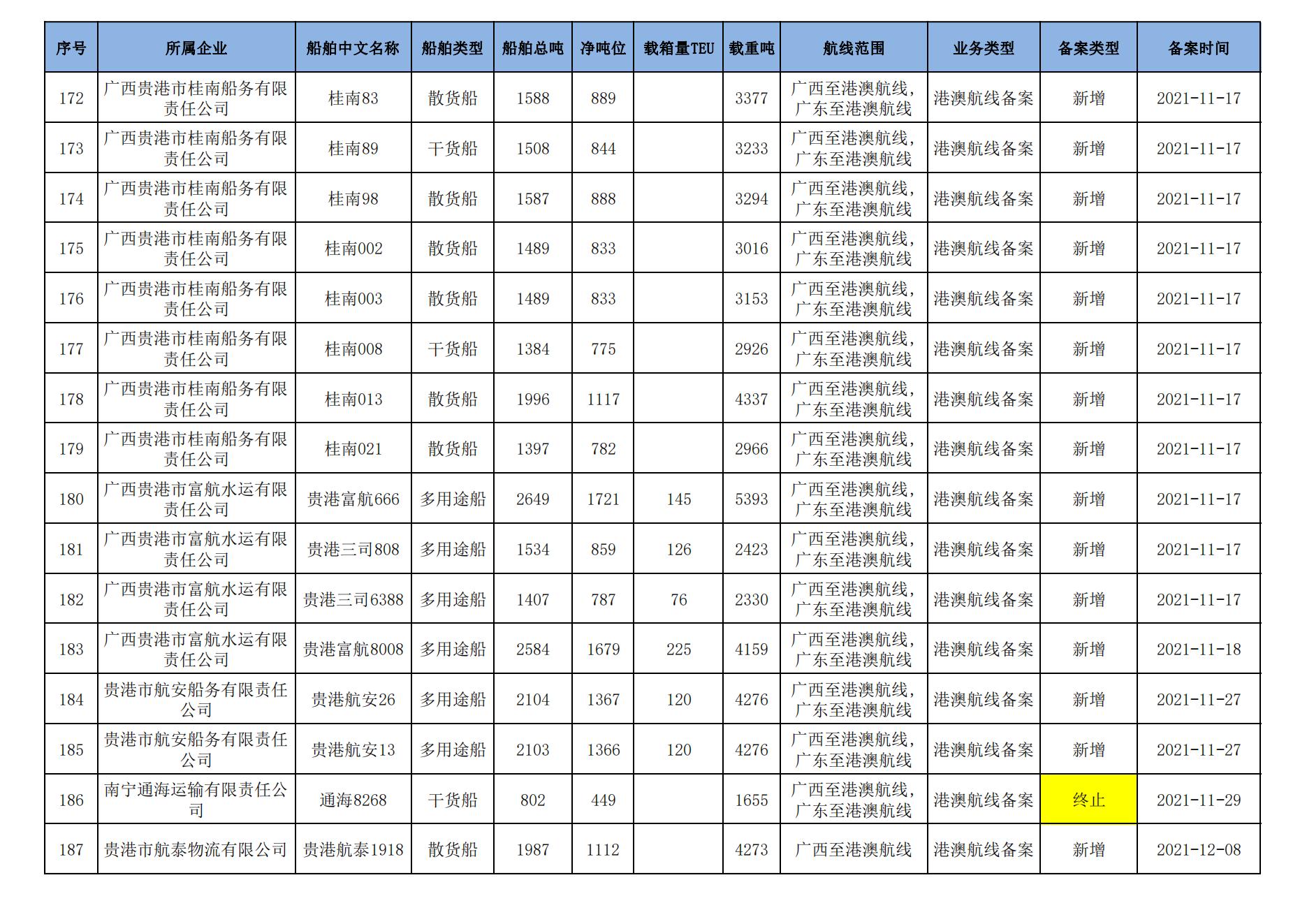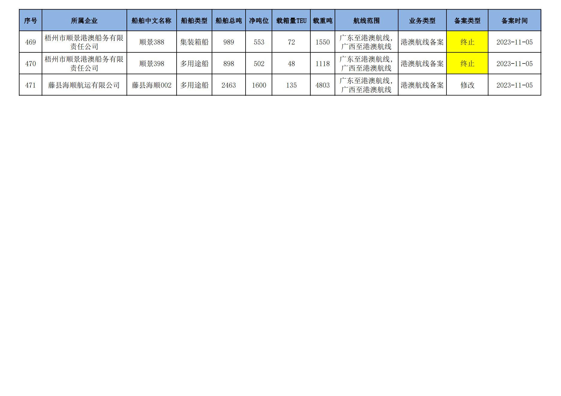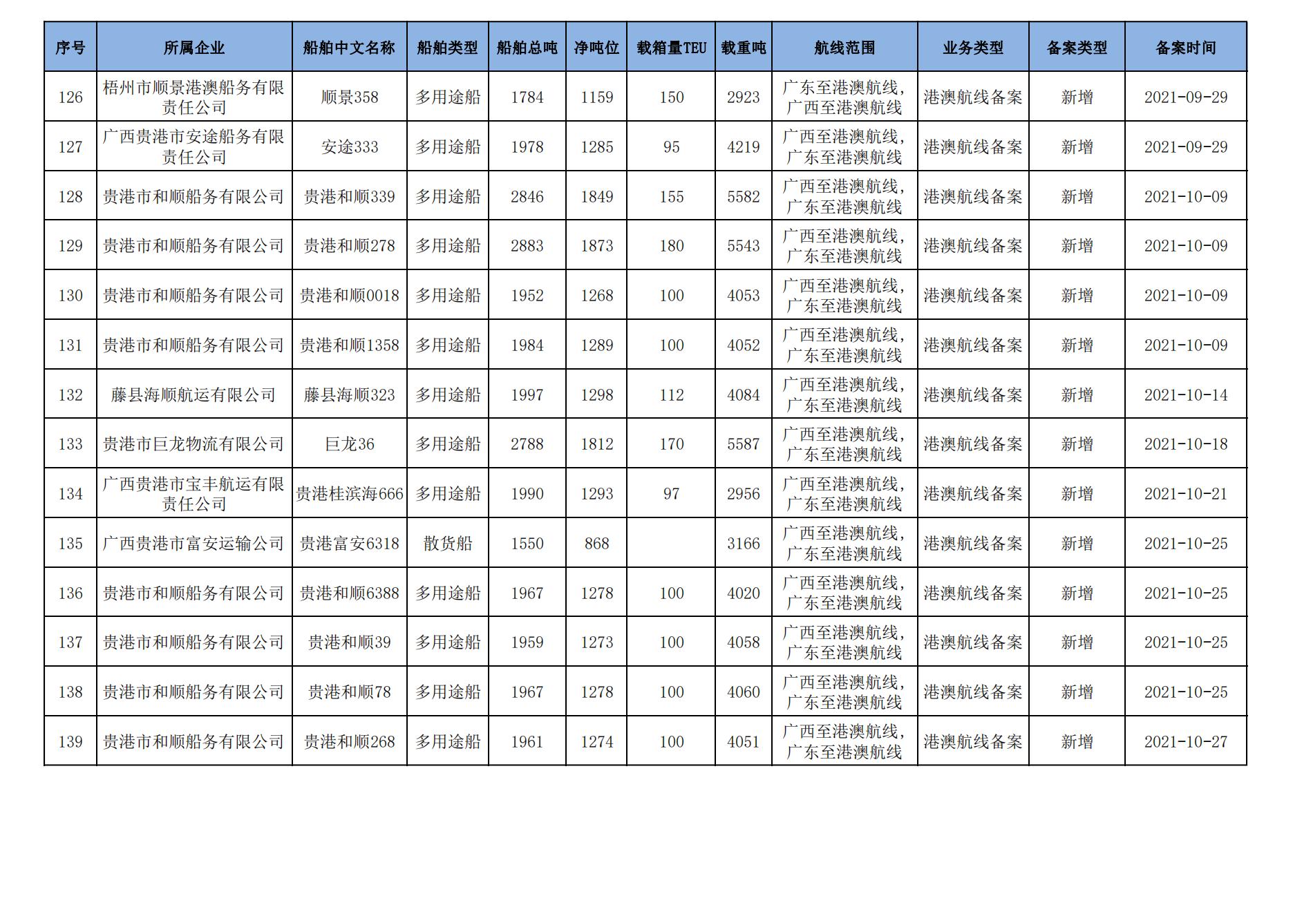 截至2023年11月11日在91porn部水路运输建设综合管理信息系统完成备案的港澳航线水路运输船舶