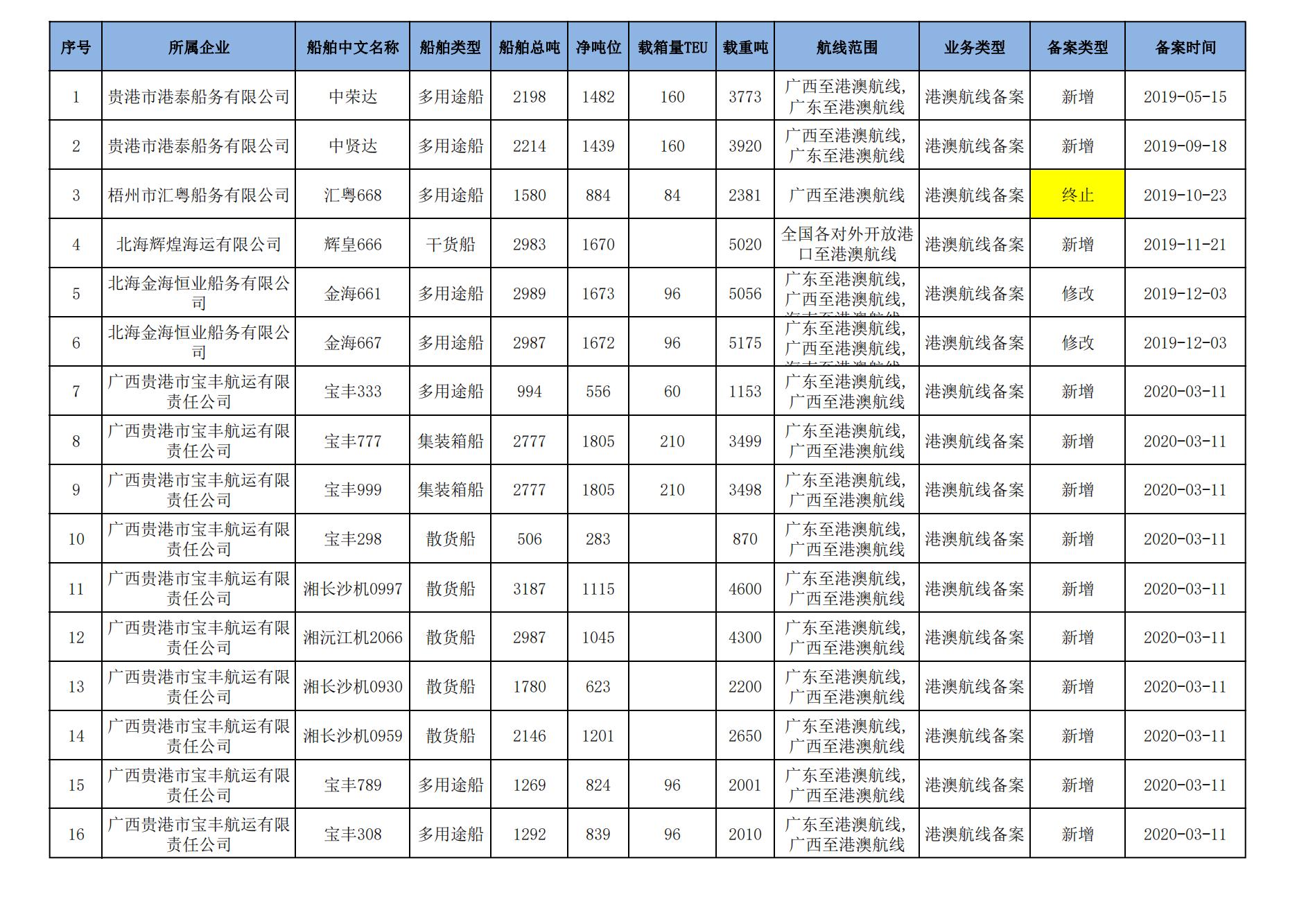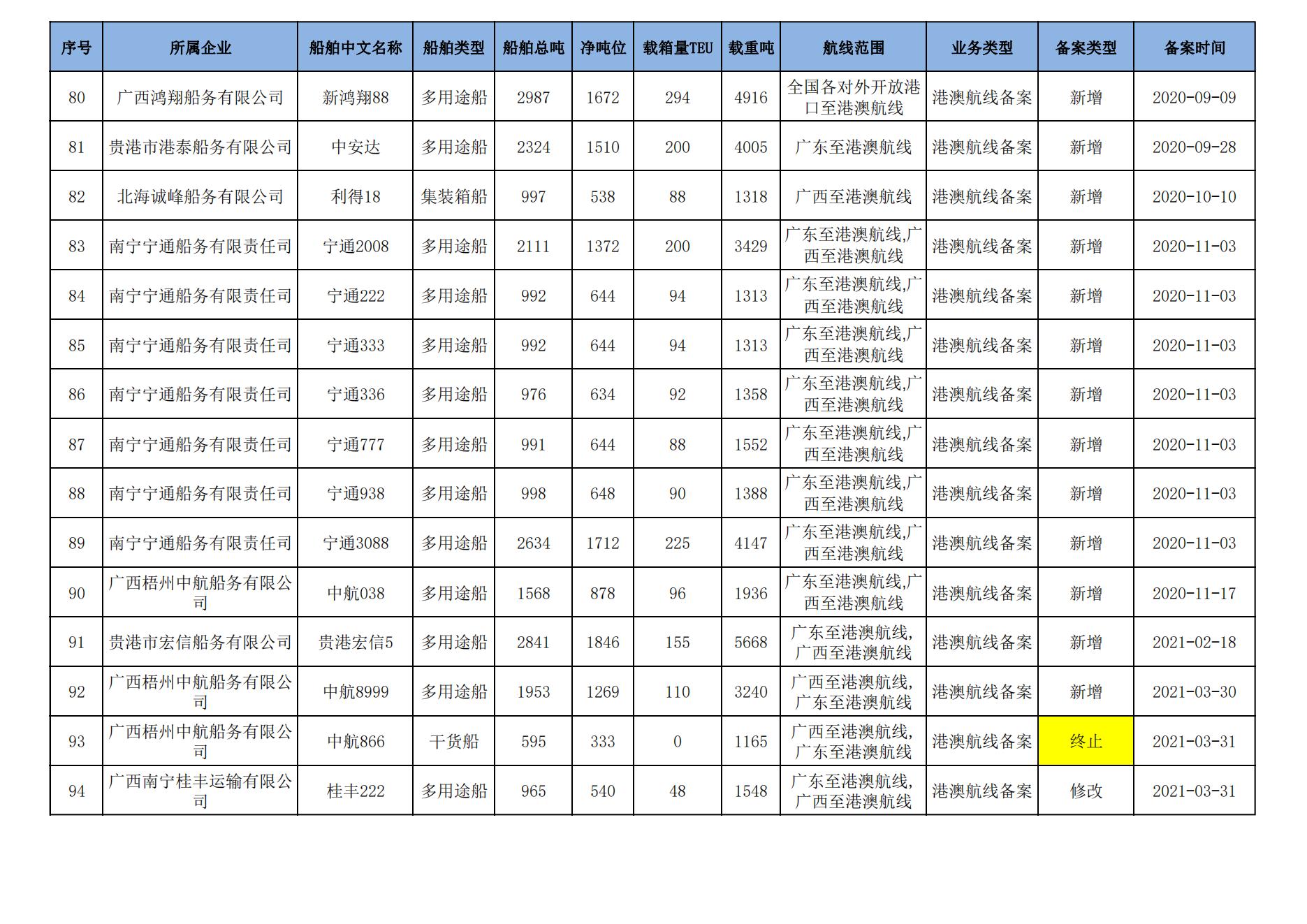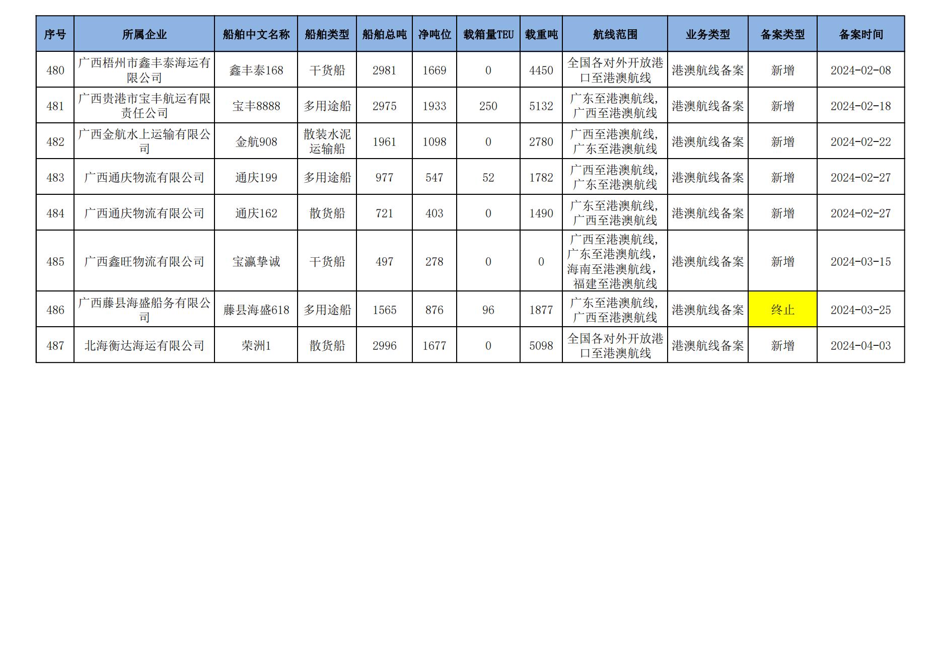 截至2024年4月11日在91porn部水路运输建设综合管理信息系统完成备案的港澳航线水路运输船舶