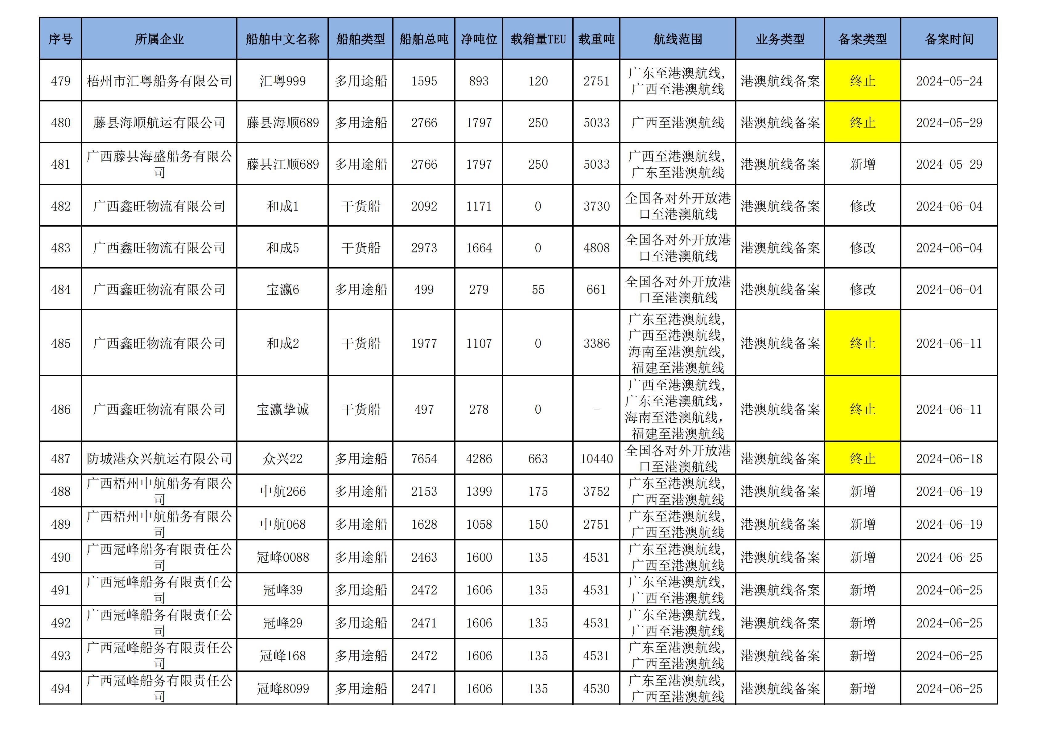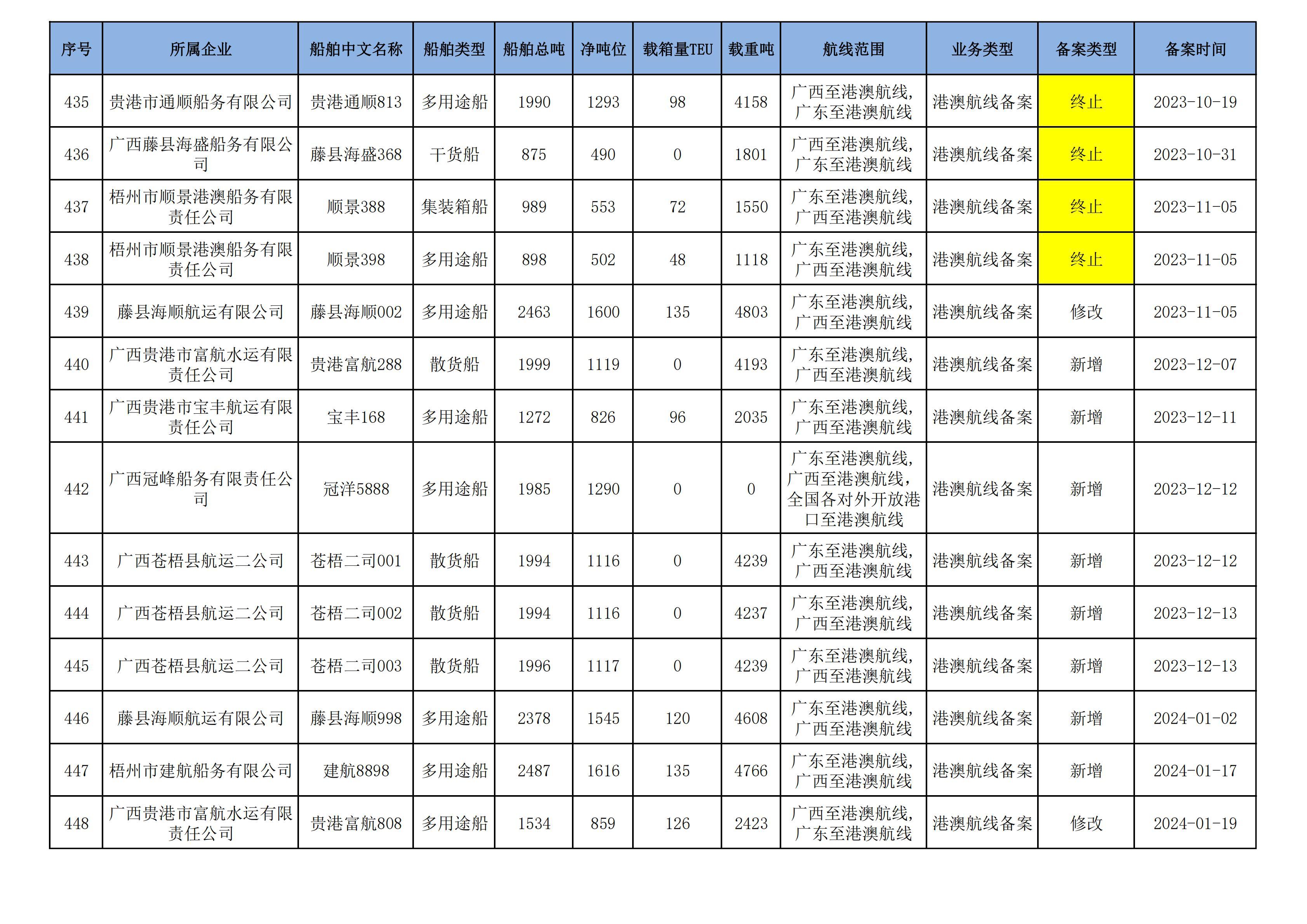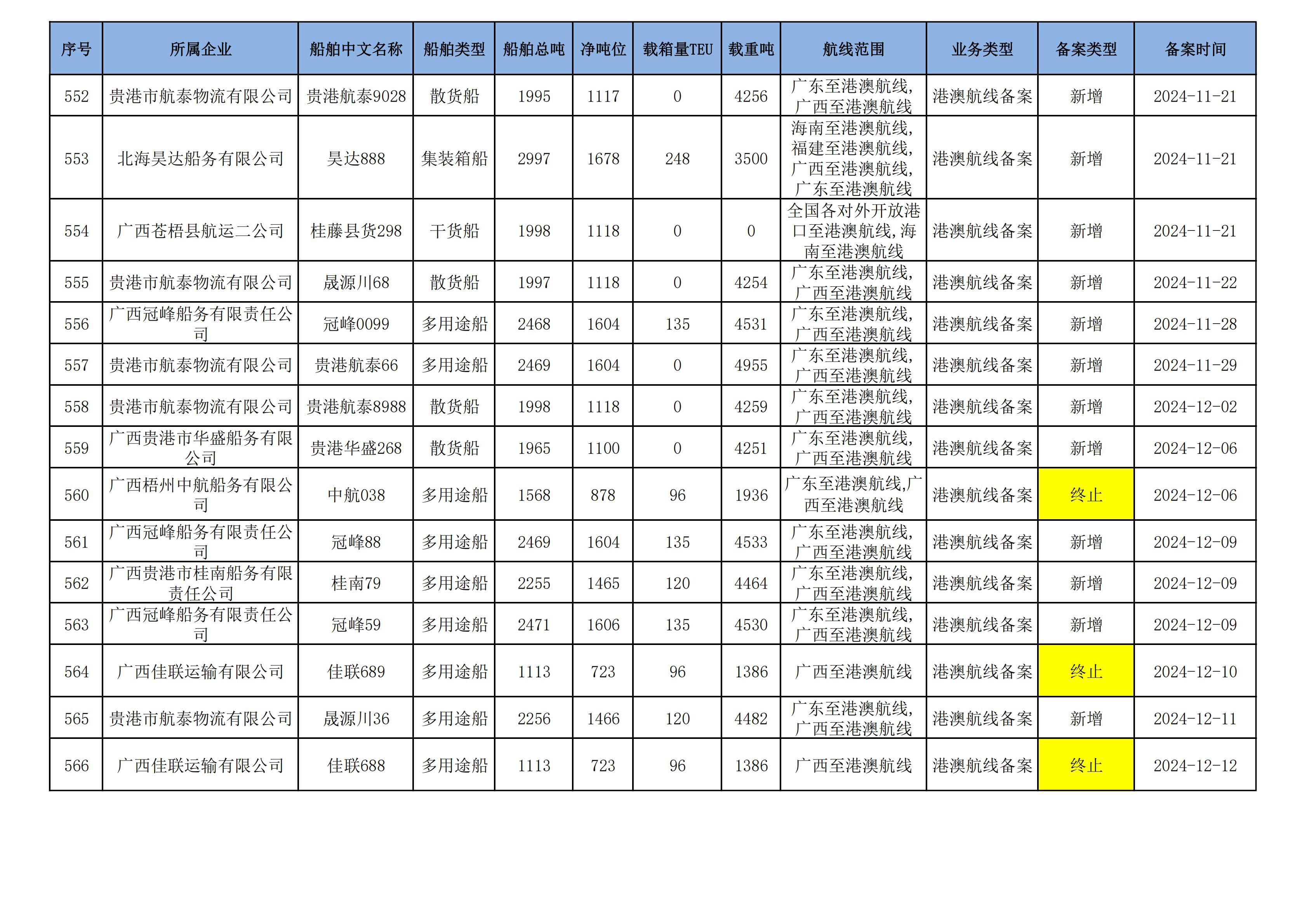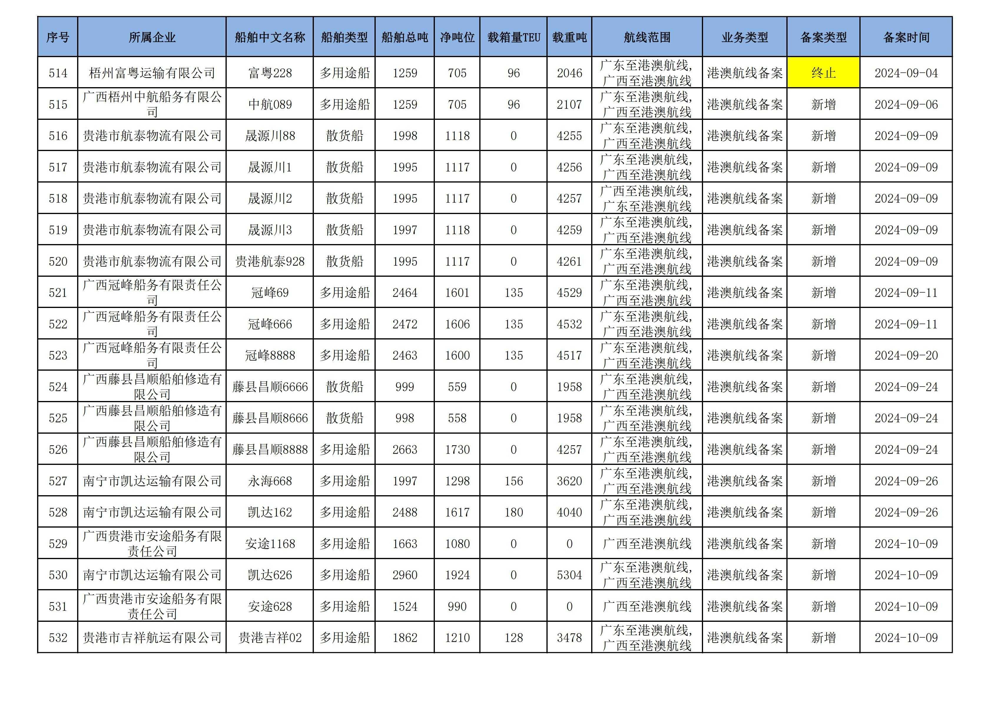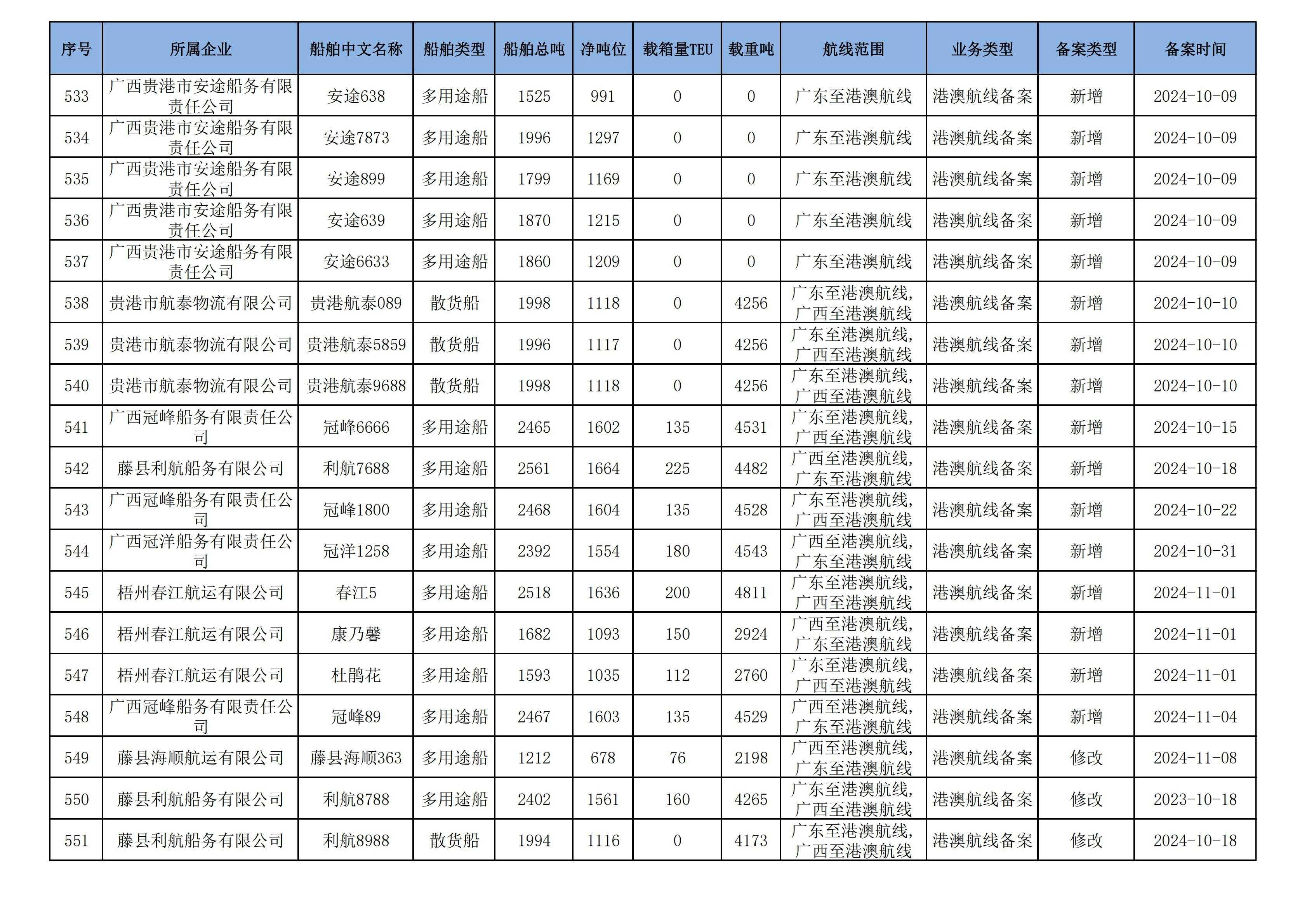 截至2024年12月12日在91porn部水路运输建设综合管理信息系统完成备案的港澳航线水路运输船舶