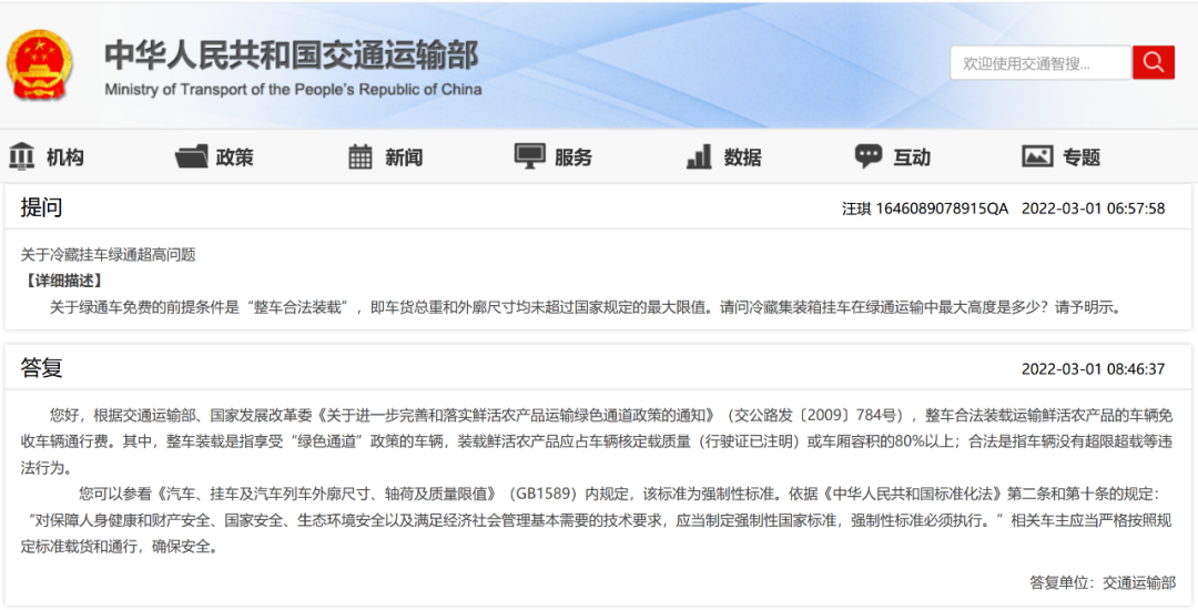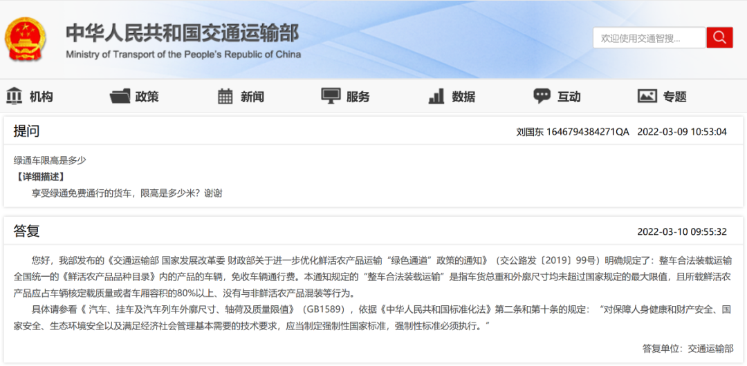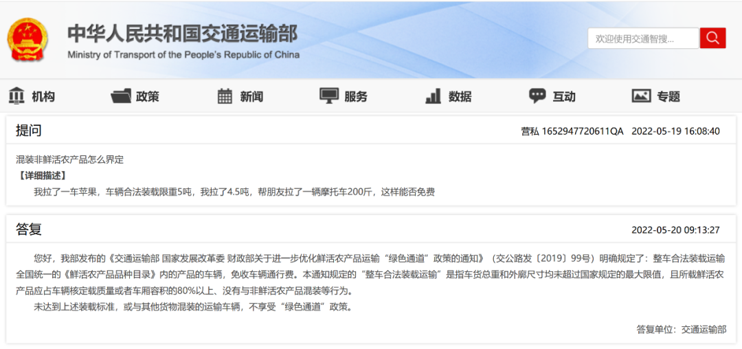 您好,我部发布的《91porn部 国家发展改革委 财政部关于进一步优化鲜活农产品运输“绿色通道”政策的通知》(交公路发〔2019〕99号)明确规定了:整车合法装载运输全国统一的《鲜活农产品品种目录》内的产品的车辆,免收车辆通行费。本通知规定的“整车合法装载运输”是指车货总重和外廓尺寸均未超过国家规定的最大限值,且所载鲜活农产品应占车辆核定载质量或者车厢容积的80%以上、没有与非鲜活农产品混装等行为。