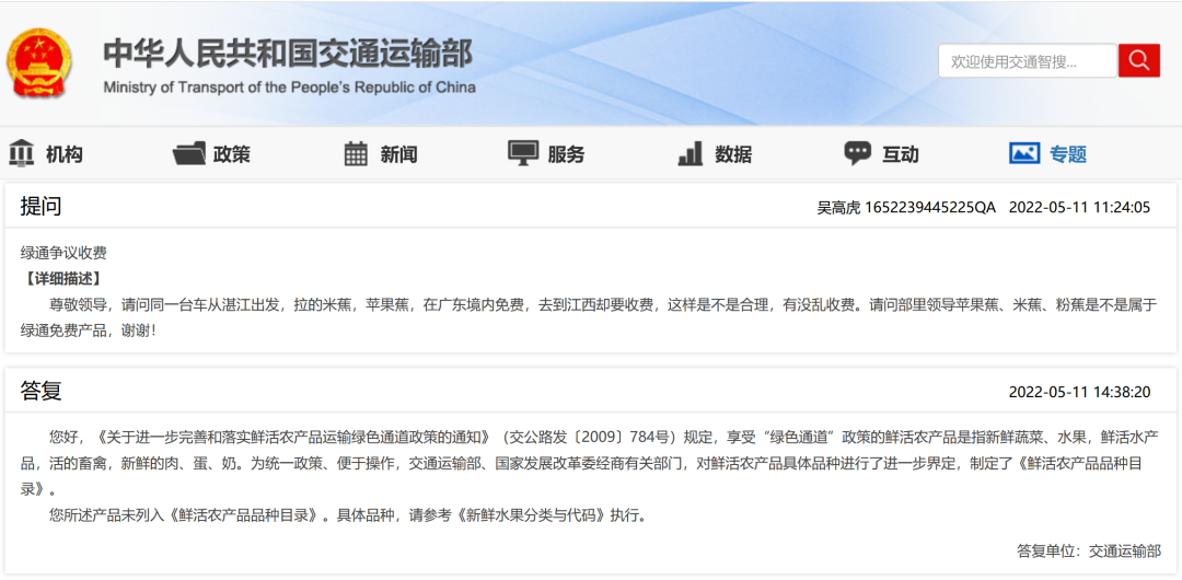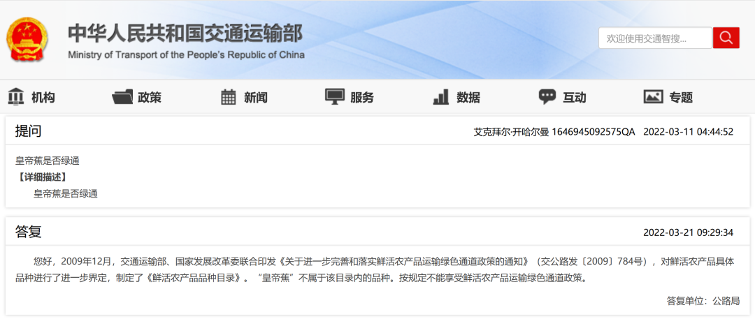 您好,2009年12月,91porn部、国家发展改革委联合印发《关于进一步完善和落实鲜活农产品运输绿色通道政策的通知》(交公路发〔2009〕784号),对鲜活农产品具体品种进行了进一步界定,制定了《鲜活农产品品种目录》。“皇帝蕉”不属于该目录内的品种。按规定不能享受鲜活农产品运输绿色通道政策。