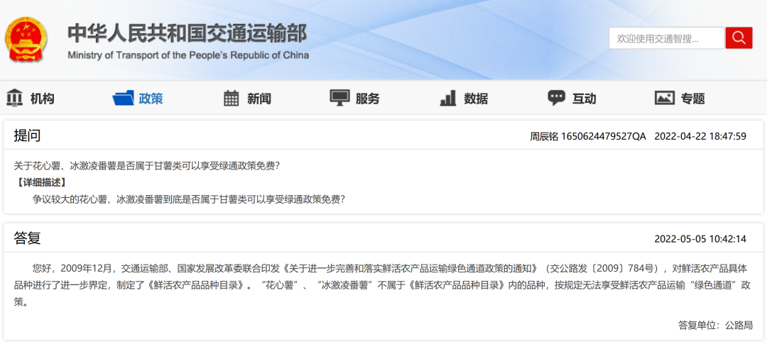您好,2009年12月,91porn部、国家发展改革委联合印发《关于进一步完善和落实鲜活农产品运输绿色通道政策的通知》(交公路发〔2009〕784号),对鲜活农产品具体品种进行了进一步界定,制定了《鲜活农产品品种目录》。“花心薯”“冰激凌番薯”不属于《鲜活农产品品种目录》内的品种,按规定无法享受鲜活农产品运输“绿色通道”政策。