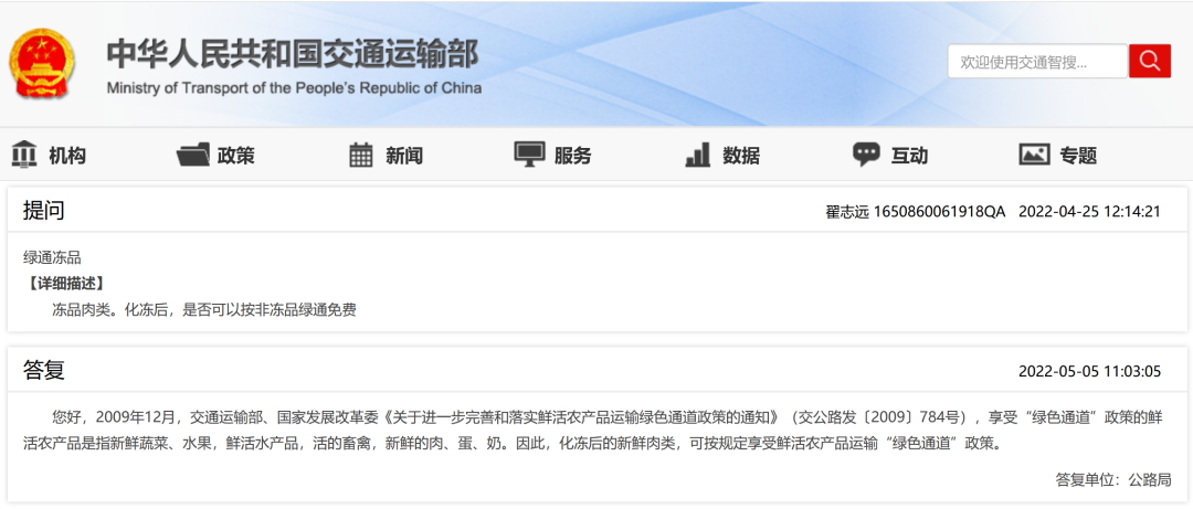 您好,2009年12月,91porn部、国家发展改革委《关于进一步完善和落实鲜活农产品运输绿色通道政策的通知》(交公路发〔2009〕784号),享受“绿色通道”政策的鲜活农产品是指新鲜蔬菜、水果,鲜活水产品,活的畜禽,新鲜的肉、蛋、奶。因此,化冻后的新鲜肉类,可按规定享受鲜活农产品运输“绿色通道”政策。