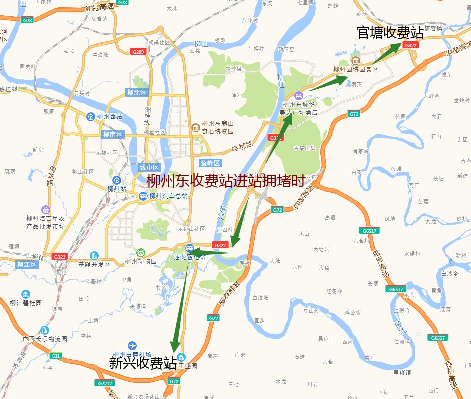 出口拥堵时,崇左方向来的车辆可选择从夏石收费站→322国道→目的地;入口拥堵时,前往崇左方向凭祥→322国道→夏石收费站→南友高速→目的地。