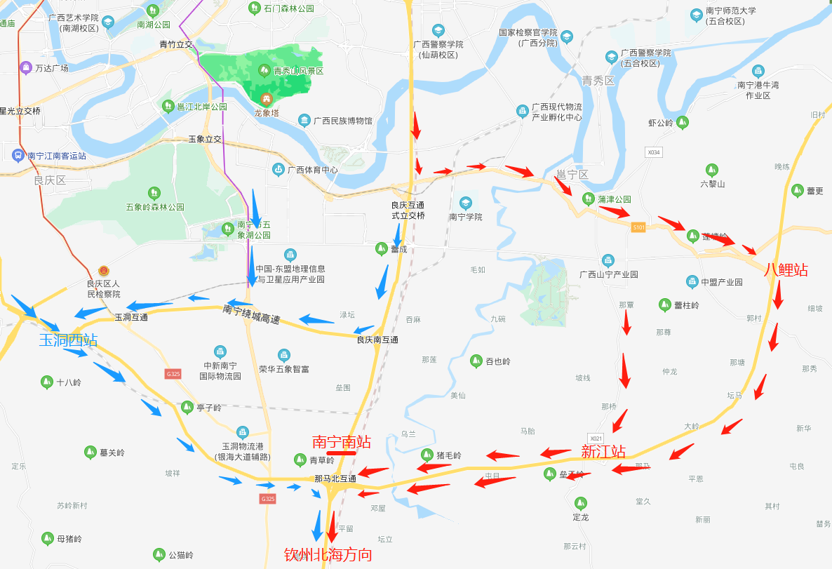 进城:可以从武鸣、伊岭岩收费站出站避开拥堵路段,绕行南武城市大道进城;或者是绕行037县道→走邕武路、高峰林场进城。