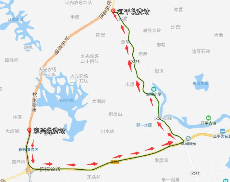 从江平收费站出站走省道S325滨海公路前往东兴市区。