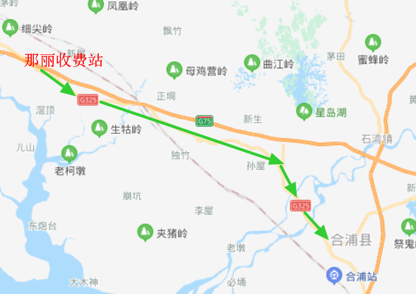 G75兰海高速→山口收费站→G228国道→公馆镇→G325国道→十字路乡→G325国道→合浦