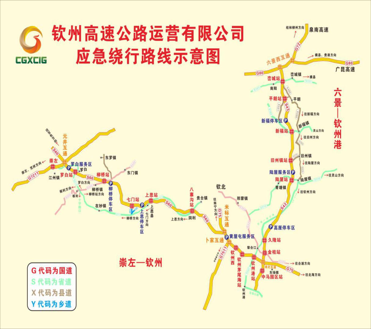 2.S60合那高速上思收费站:往崇左方向的车辆→上思收费站出口→311省道→上思县城、七门乡→七门收费站入口→崇左市;往钦州方向的车辆→七门收费站出口→311省道→上思县城团结路→上思收费站入口→钦州市。