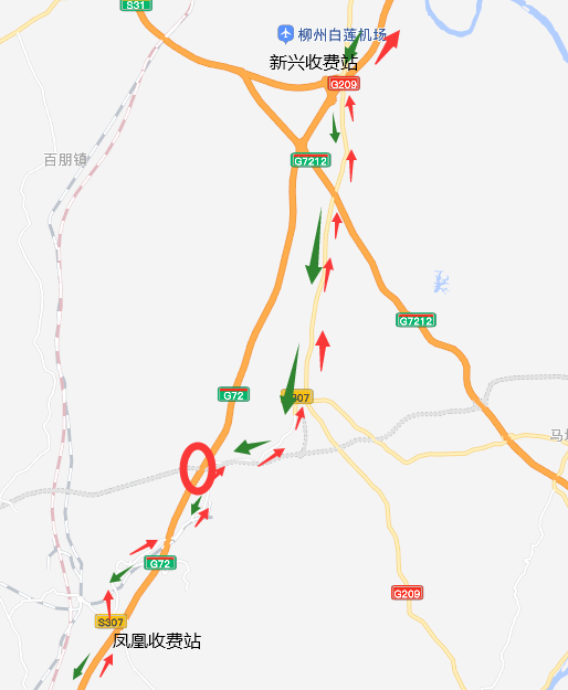 1.G72泉南高速柳州往南宁方向:从新兴收费站下走G209国道至S307省道绕行至凤凰收费站上。(绿色箭头)