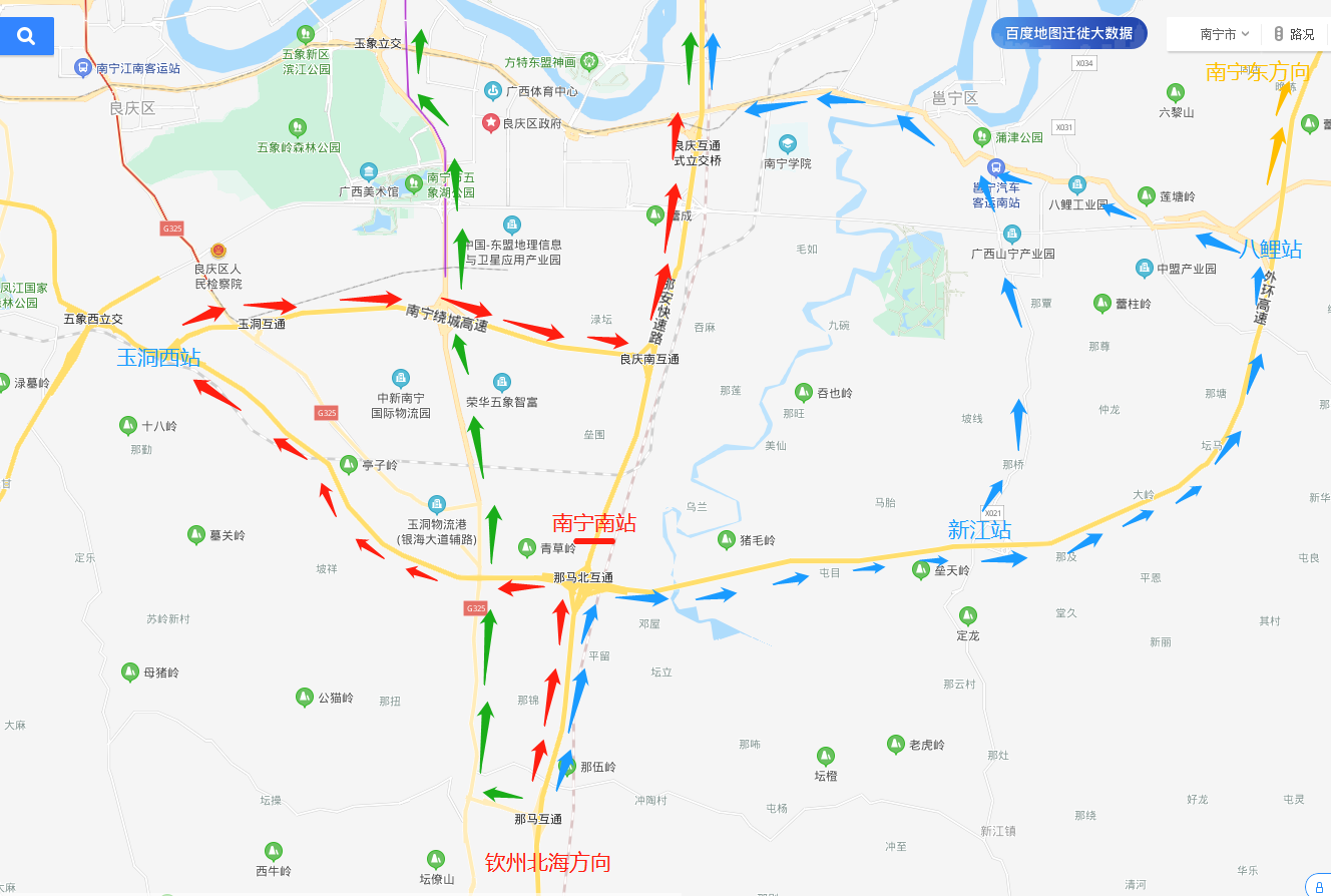 2.从柳州、桂林往南宁方向的车辆在良江互通改往S52武平高速公路来宾至马山段,经迁江、三里、上林、西燕、古零、马山南,在乔利互通转入G75兰海高速马山至南宁段行驶,如遇乔利互通缓行,可从马山南收费站出站行驶G210国道,前往目的地;或从G72泉南高速宾阳站出站至G324国道途经大桥镇、新桥镇、昆仑镇、五塘、三塘进入南宁市区。