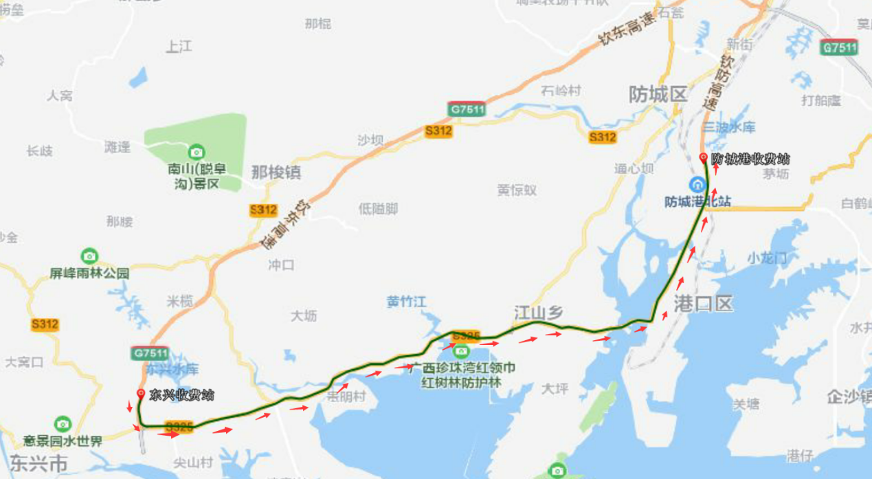 2.由省道S325滨海公路→西湾大桥→北部湾大道从防城港收费站进高速