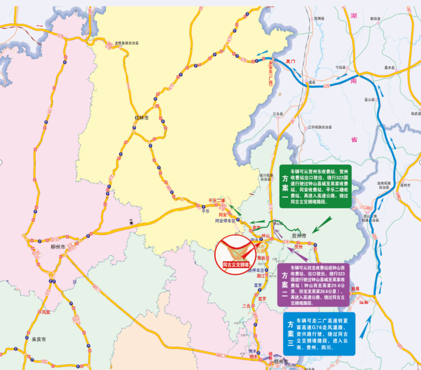 方案一:绕G78汕昆高速贺州东收费站、贺州收费站下高速→323国道→钟山县→英家、同安、平乐二塘收费站→G65包茂高速。