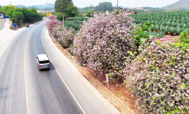 当春风拂过,国道241线玉林市博白县东平镇路段公路两旁的紫荆花竞相绽放,紫红色的花簇缀满枝头,晚唐诗人笔下的岭南春色便跃然眼前。这公路上的春天,就藏在这一树树绚烂的紫荆花里。越过簇簇花枝,远处忙碌的养路人让这景色愈加生动活泼,这公路上的春天,也藏在公路人奋斗的脚印里。