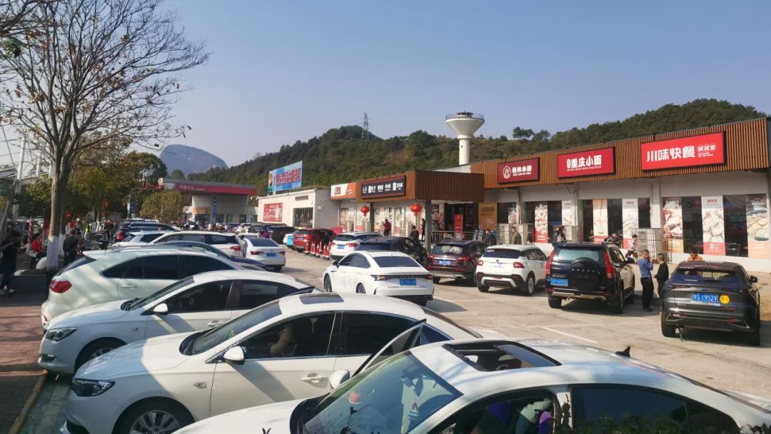 大家可以看到,我所在的同古服务区,现在已经停满了车辆。