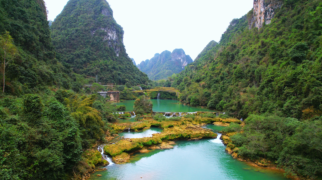 很多人说广西最美的风景不在景区而在路上。在国道219线崇左大新路段稔底隧道旁,就有一个山水天成、层层叠瀑的景点——沙屯叠瀑。