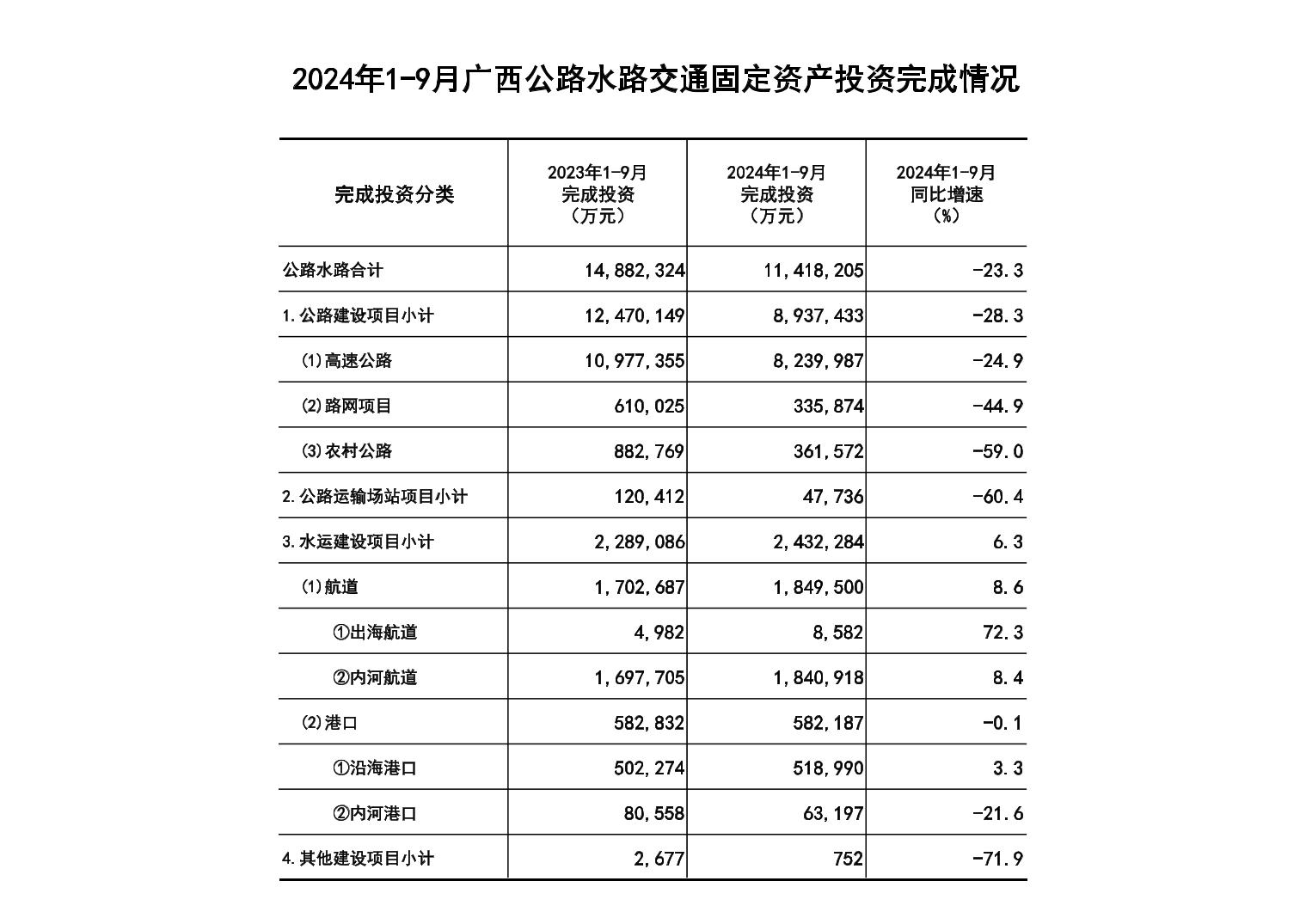 2024年1-9月广西公路水路交通固定资产投资完成情况