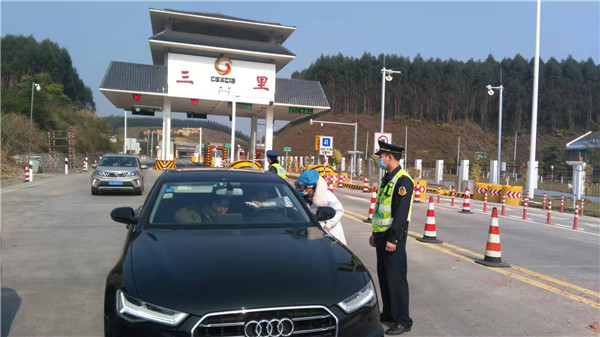 工作人员在G75兰海高速S7513都安联络线都安收费站防疫检测点值守。