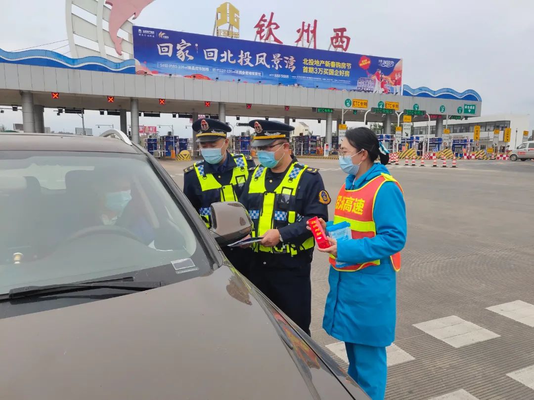 仪式后,全体人员参观了“向海之路”警路企党建联盟基地,感受“警路企”协同共建工作成效。全体人员组成志愿服务队在钦州西收费站开展“情满旅途”春运便民志愿服务活动,为过往司乘人员提供热姜茶水、应急药品、简易维修工具等物品,并赠送一次性口罩、春联、保温杯等礼品,解读宣传安全文明行车知识。最后,“警路企”召开2021年春运春节安全保畅工作联席会,共同筹划落实春运春节期间保通、保畅、服务等各项工作措施,为社会公众营造“畅安舒美”的行车环境。