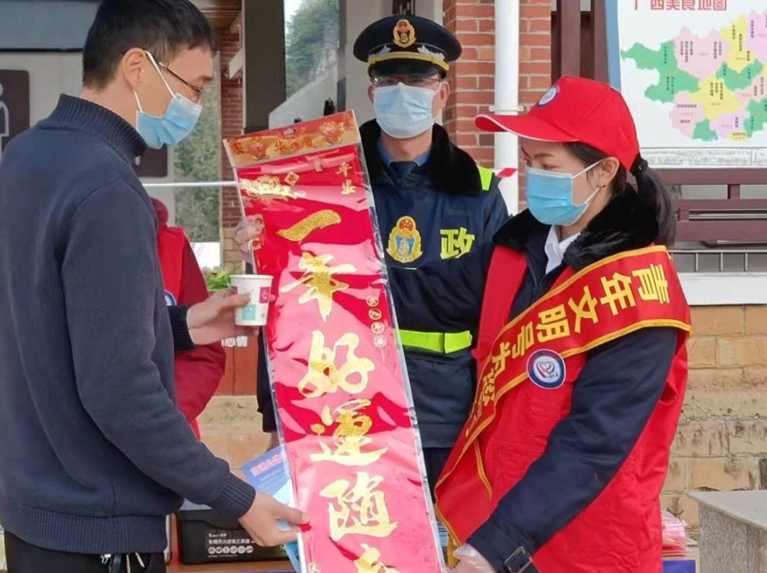 活动现场,该大队执法人员和交警、运营公司志愿服务工作人员热情地向过往司乘人员递上一杯热乎乎的姜汤,驱走冬日的严寒;发放一幅幅春联、福字帖,让阳光服务渲染浓浓的春节气息;句句温馨的疫情防控知识宣传,传递着交通一线人对同胞的关爱,一则则交通安全事故的典例宣讲,表达了交通执法者对群众安全出行的责任担当和对生命的敬畏。此外,志愿服务者还为广大司乘人员准备了应急医药箱、工具箱、出行服务指南等便民工具及资料。