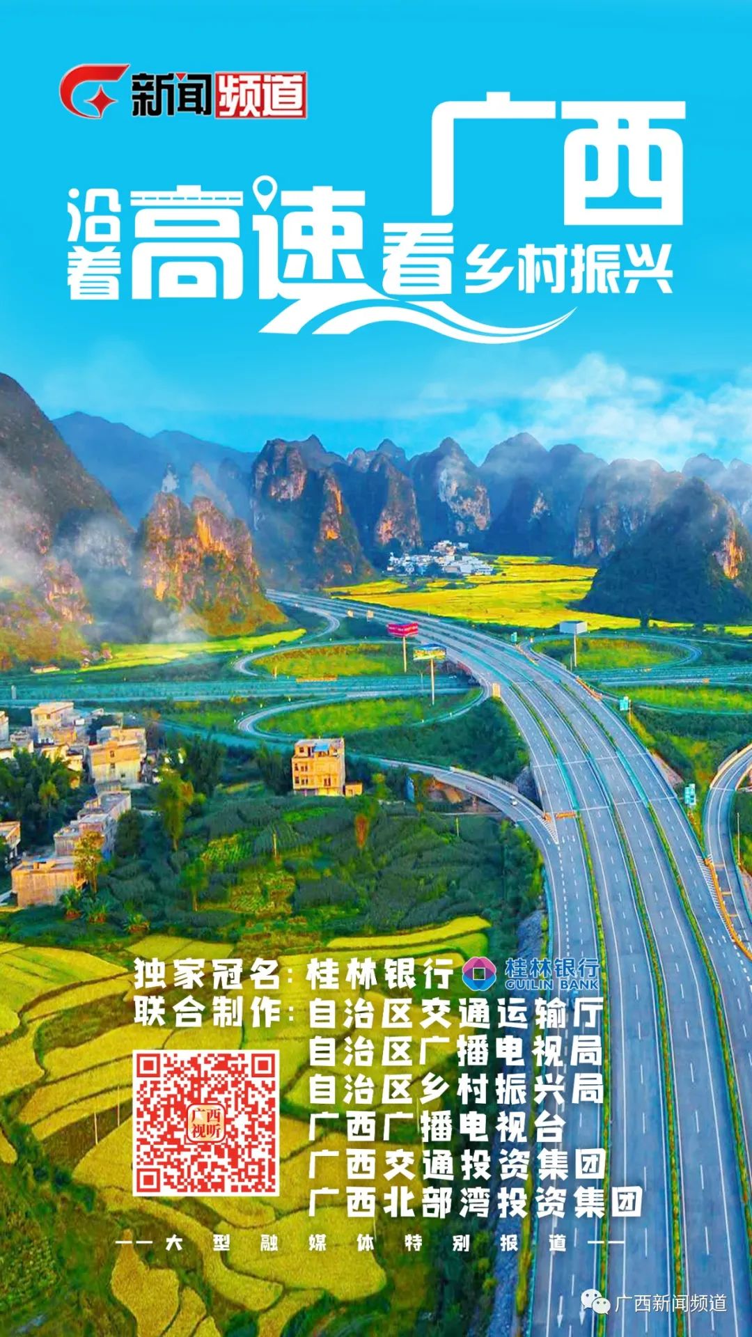 《沿着高速看广西·乡村振兴》特别节目播出时间:2021年8月29日起,广西新闻频道每周日12:00-12:30,广西视听app、新闻频道新媒体矩阵同步引流直播,沿着高速深入展示1个市、县(市、区)的风貌和成就,敬请期待。