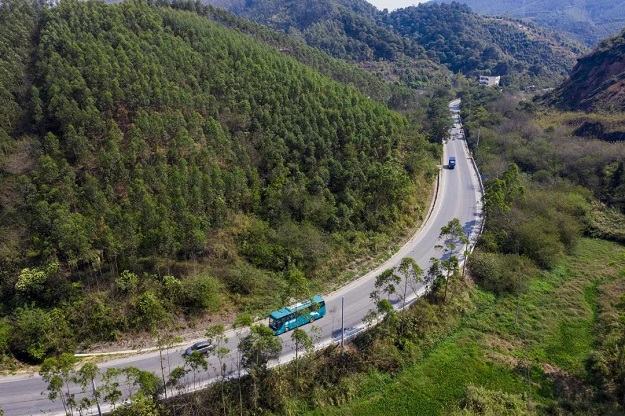 国道324线莲塘路段如蛇一般穿梭在翠绿山林间。