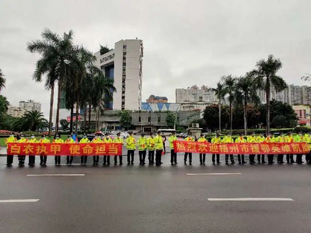 梧州执法人在雨中欢迎援鄂英雄回家。