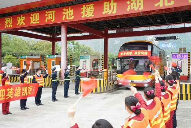 4月8日上午,河池高速高速“企路警”组织党员、团员青年在河池东收费站列队,热烈欢迎河池市援鄂医疗队凯旋,以礼宾规格迎接英雄们回家。