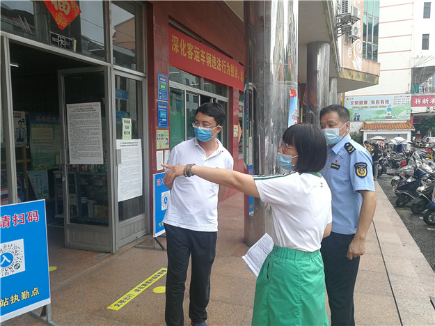 欧阳斌在凭祥汽车站听取疫情防控工作情况。