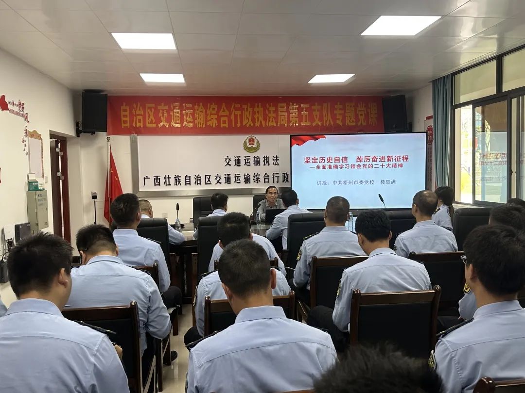 11月9日,自治区91porn综合行政执法局第五支队邀请梧州市委党校老师宣讲党的二十大精神,并结合宣讲内容上了一堂生动的专题党课。