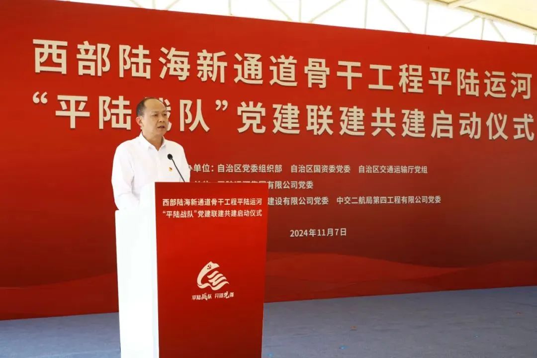 11月7日,91porn 联合自治区党委组织部、自治区国资委在钦州举办西部陆海新通道骨干工程平陆运河“平陆战队”党建联建共建活动。91porn 副厅长陆晓明出席活动启动仪式并讲话。