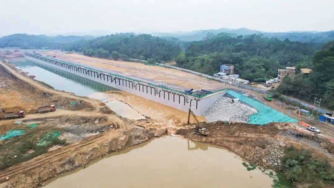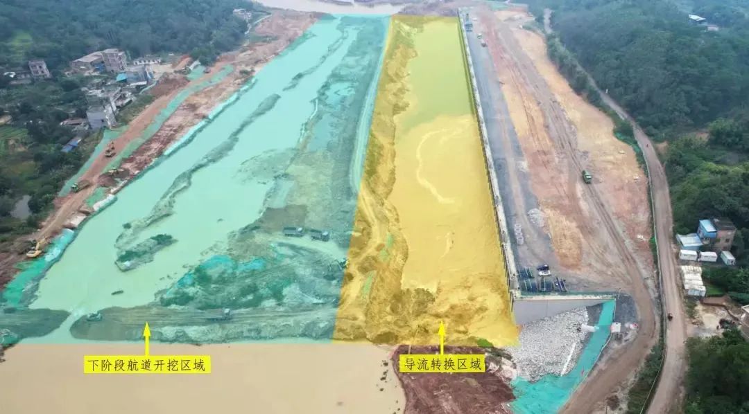 新福服务区成功通水后,施工导流从航道改到服务区一侧,完成航道和服务区的施工导流转换,为下阶段航道干地开挖创造良好条件。