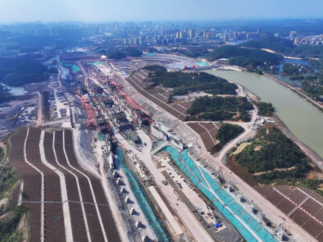 本次浇筑点位于船闸下闸首右边墩上段,混凝土浇筑方量为447.97立方米。为高效有序推进施工,平陆运河建设管理团队做实做细施工计划,科学严密组织施工。一是加强资源配置,明确责任分工,严格把控预埋件安装精度、钢筋间距以及保护层等质量指标,确保各项施工有序进行;二是在船用钢板后增设竖向和横向角钢,加强钢板刚度,同时将锚筋焊接在加强肋上,以消除焊接温度应力的影响,从而保证护面钢板精度和质量;三是采用风冷+片冰+冷却水结合的混凝土预冷施工工艺,引进混凝土智能温控系统,根据温度变化实时调整温控措施,确保混凝土浇筑质量。