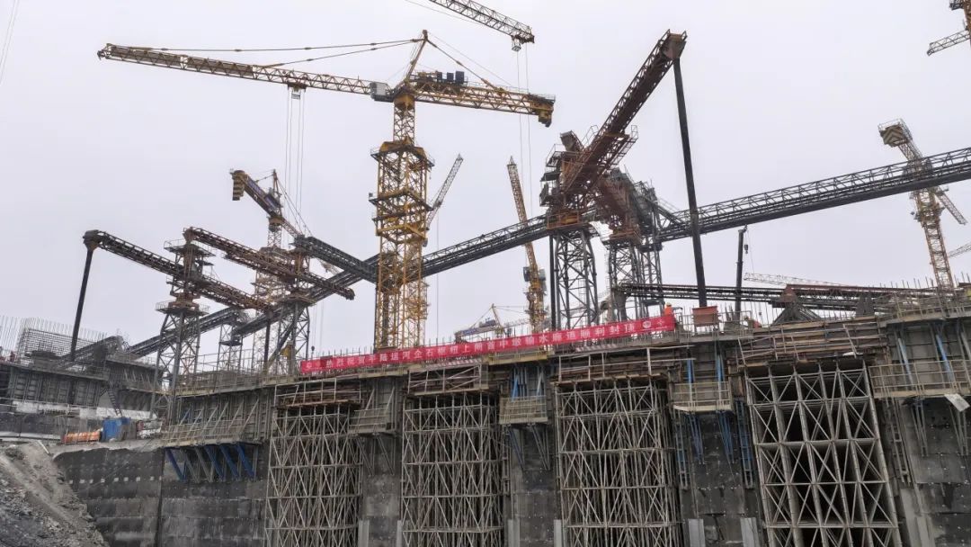 为了解决复杂多样的输水廊道施工难题,由平陆运河集团及相关参建单位组成的平陆运河建设管理团队在春节期间集中人员、设备等资源针对关键线路施工进行再攻坚,通过严格控制异形段施工模板的垂直度、模板弧度及钢筋绑扎精度,确保输水廊道施工质量;采用廊道楔形找平法,有效提升异形段施工效率;强化廊道抗冲磨混凝土振捣精度,确保混凝土施工质量;采用智慧胶带机布料系统+汽车式布料机进行协同作业,实现了封顶段混凝土高效浇筑、大体积混凝土快速入仓。