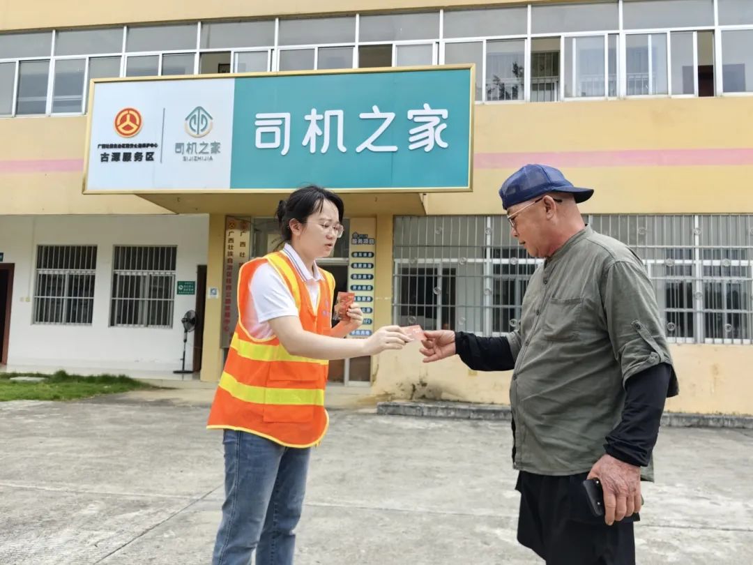 隆安公路养护中心工作人员在古潭服务区向过往客商发放“清廉公路监督卡”。